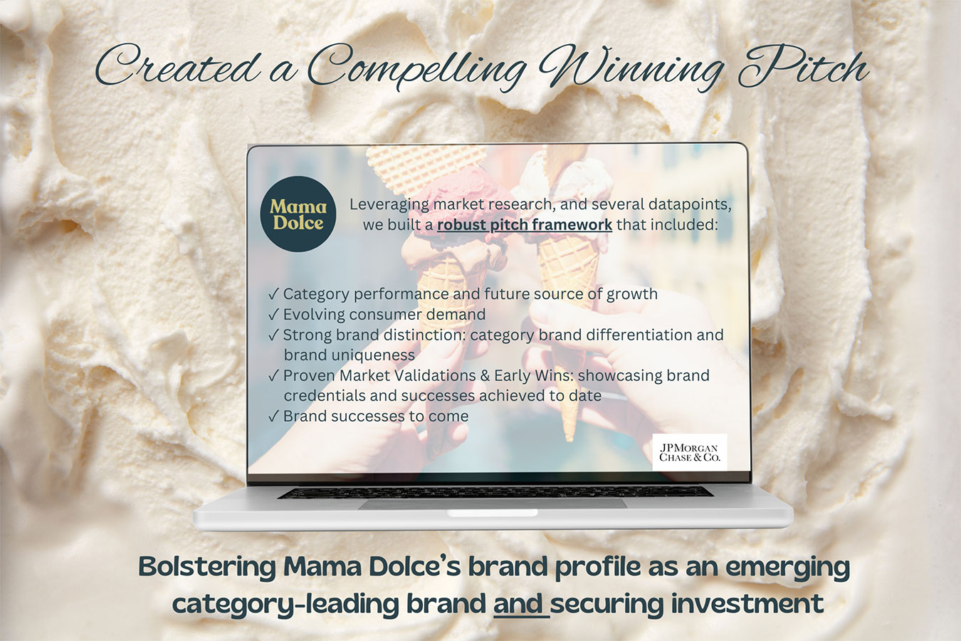 Skip to contentIntroduce Mama Dolce’s brand pitch in a competition with a reputable wealth investment firm. Positioning this emerging brand as “The next category leading brand” within the developing Vegan Ice cream sub-category.